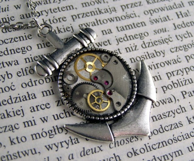 Naszyjnik w stylu steampunk. baza z oksydowanego metalu i zatopione w żywicy zegarkowe różności. Wymiary zawieszki 3,2 x 4,5 cm, długość łańcuszka ok 60 cm.