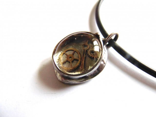 Wisiorek wykonany z miedzi, cyny, szkła i części do zegarka. Wymiary ok. 1,7 na 1,7 cm. Zawieszony na czarnej lince kauczukowej o długości ok. 45 cm.