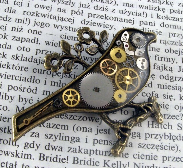 Przepiękna broszka w stylu steampunk. Mosiężna baza o wymiarach 6 x 2,5 cm i zatopione w żywicy zegarkowe różności.