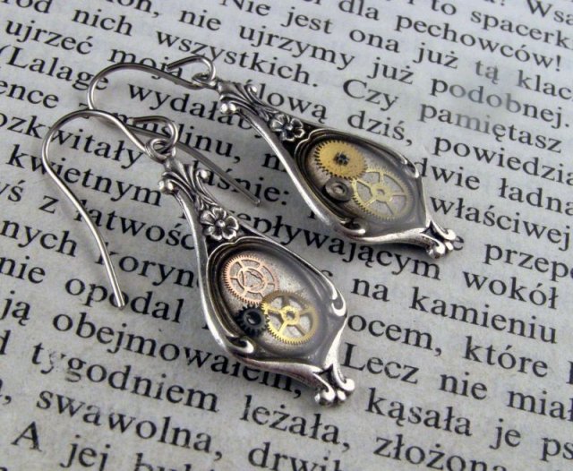 Filigranowe kolczyki w stylu steampunk. Wykonane z metalowych baz w kolorze oksydowanego srebra o długości 3 cm i zatopionych w żywicy zegarkowych zębatek.