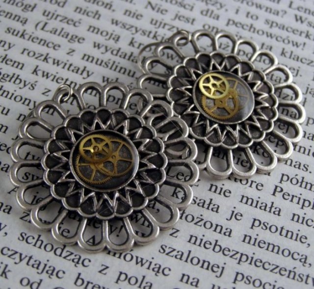 Kolczyki na czasie w stylu steampunk :) Wykonane z pięknych rozetek i zatopionych w żywicy zegarkowych różności. Średnica 3,3 cm.