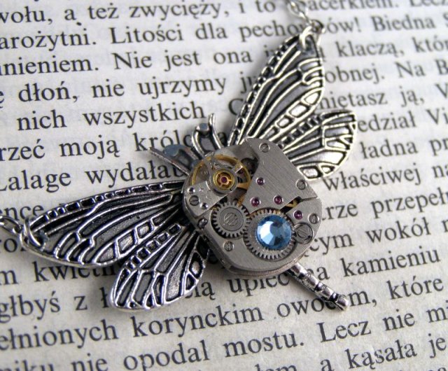 naszyjnik w stylu steampunk. Metalowa baza w kształcie ważki o wymiarach 5 x 3 cm, oryginalny mechanizm zegarkowy i kryształek Swarovskiego. Długość łańcuszka ok 60 cm.