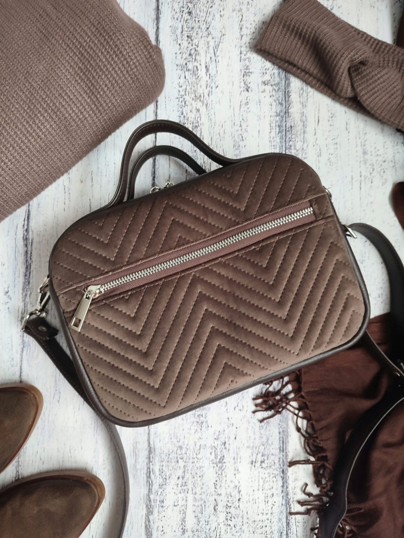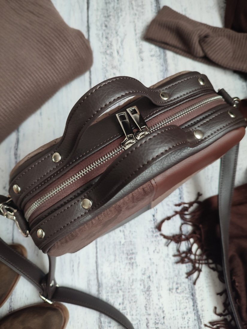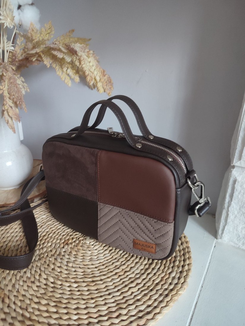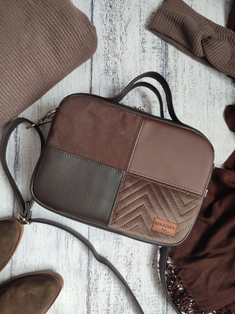 Uszyta jest z połączenia brązowych tkanin o różnych fakturach – ekoskóra, nubuk, welur.