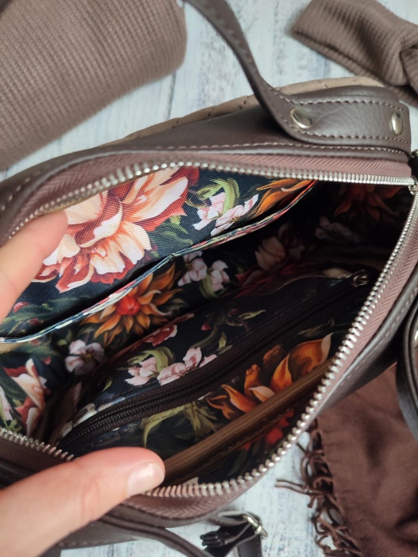 Torebka ma kieszeń na zamek na zewnątrz, jedną w środku i dwie wsuwane.