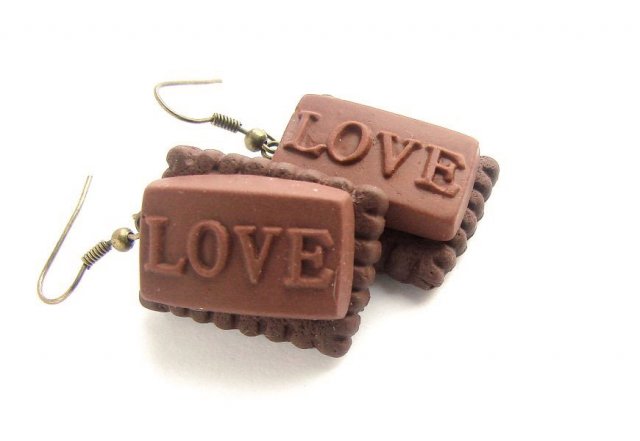 Kolczyki słodkie czekoladowe ciastka z czekoladka wykonane ręcznie z masy termoutwardzalnej. Bigle w kolorze antycznego brązu. Wielkość ciasteczek ok 2 x 3 cm