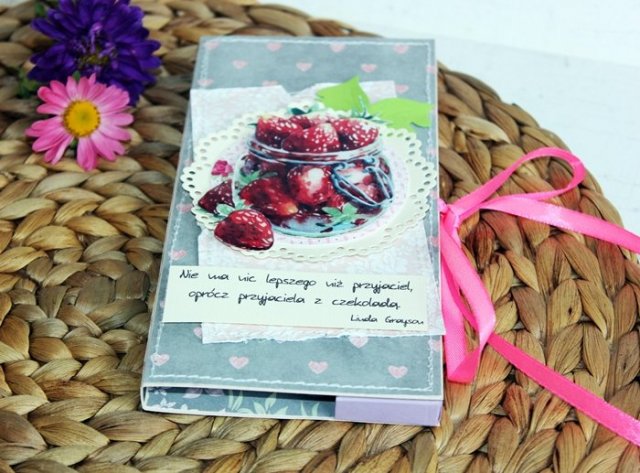 Truskawkowy czekoladownik lub czekokartka, czyli połączenie kartki z opakowaniem na czekoladę. Doskonały upominek dla przyjaciółki czy przyjaciela. Wykonany z grubego papieru, ozdobiony elementami 3D oraz przeszyciami maszynowymi. Istnieje możliwość wklejenia życzeń przesłanych przez klienta.