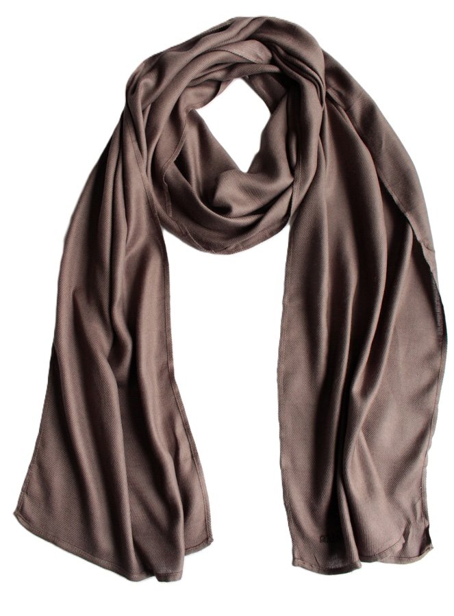 Miękki, miły w dotyku szal ciepłym odcieniu brązu. Materiał to prawdopodobnie wiskoza.