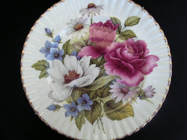 Duży i szlachetnie porcelanowo-dźwięczący talerz, sygnowany koronnie, angielski :) Pieknego bukietu malatura, ryflowanie na zewnętrznym okręgu i przyprószane złocenie na rancie. Bardzo efektowny, na błyszcząco szkliwiony. 26,5 x 2,5 cm. Stan zachowania bardzo dobry.
