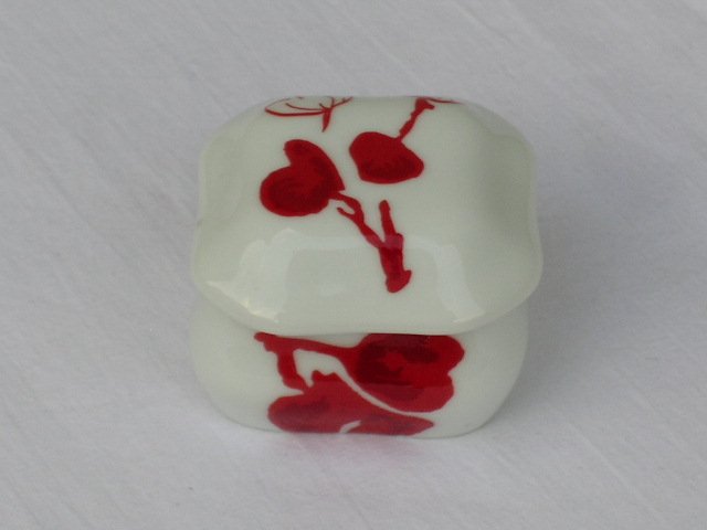 Ciekawie zdobione puzderko porcelanowe, sygnowane Limoges. Biel dźwięczącej porcelany i kwiatowo-serdeczny wzór w makowej czerwieni. 5 x 6 x 3,5 cm. Stan zachowania bardzo dobry.