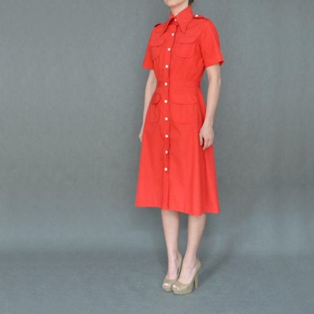 Śliczna, czerwona szmizjerka vintage. Zapinana na białe guziczki, w talii dopasowana, z patkami na ramionach. Na piersiach i pod talią po dwie kieszonki. Sztywny kołnierzyk, dość wąski obwód kołnierzyka. Polecam bardzo.