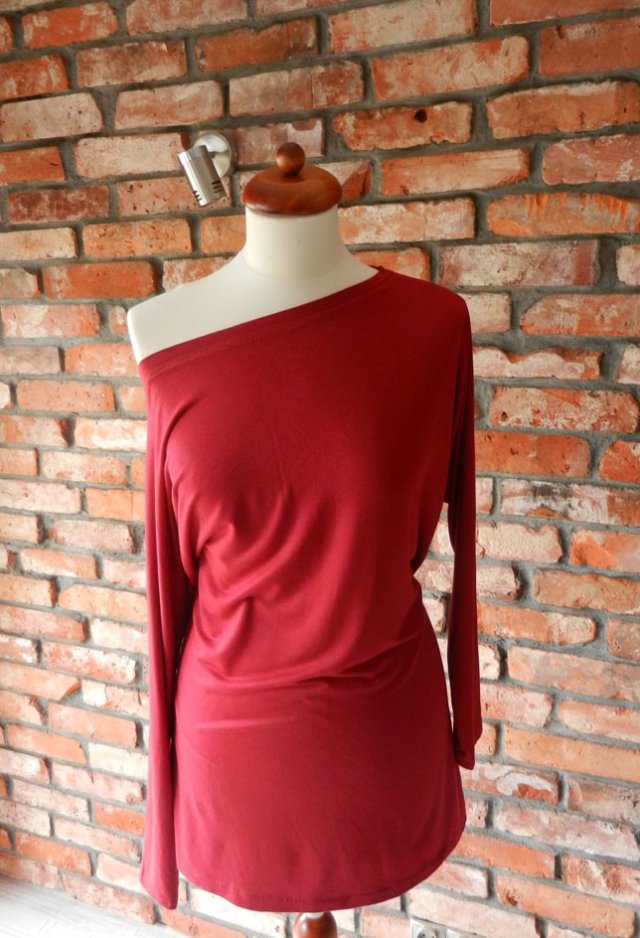 Piękna, wiskozowa bluzka opadająca na jedno ramię. Luźny fason. Z tyłu guziki. Tył dłuższy.