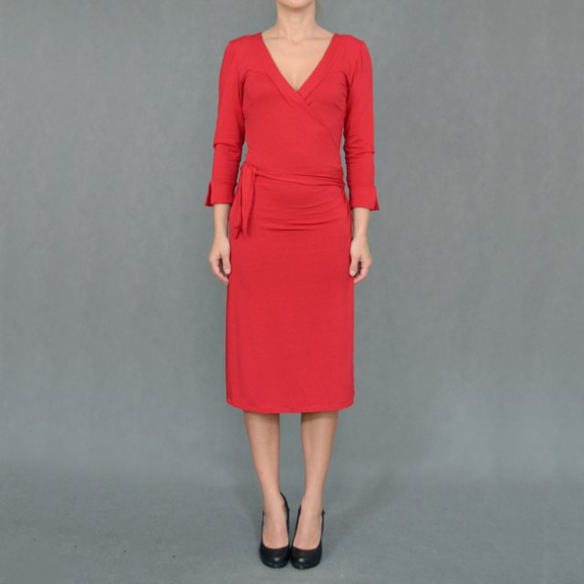 Czerwona, kopertowa sukienka. Wiązana z boku. Czerwień dość stonowana.