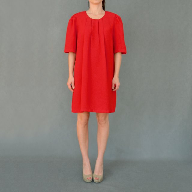 Piękna sukienka marki ATMOSPHERE w kolorze intensywnej, głębokiej czerwieni. Krój dość minimalistyczny, minimalnie rozszerzany, wzbogacony z przodu delikatnymi kontrafałdami i lekkimi bufkami na ramionach. Z tyły pokaźny zamek. Bez podszewki, materiał nie prześwituje, jest grubszy i mięsisty.