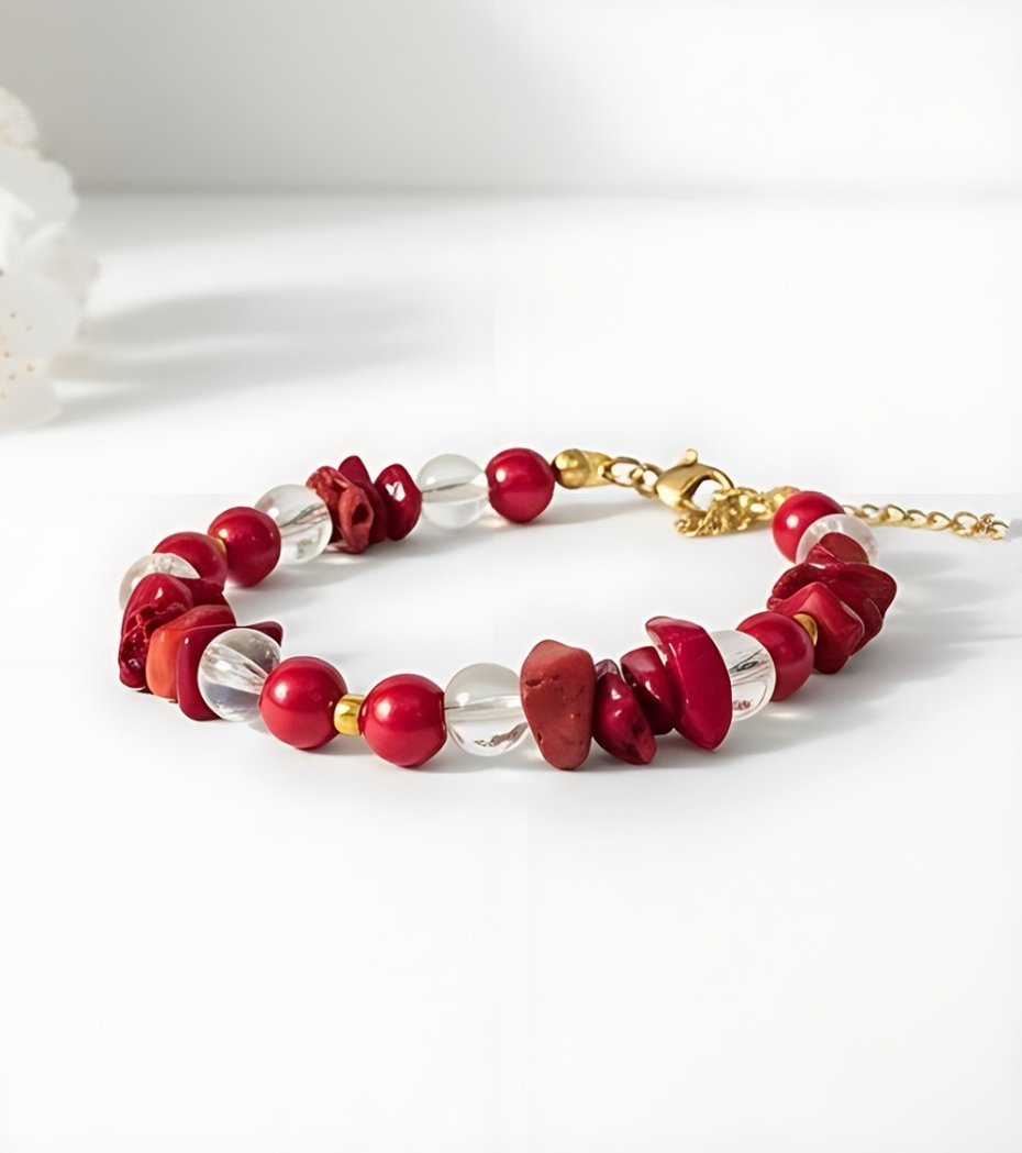 B3009 Bransoletka z sieczki czerwonego korala i szklanych kul 6mm.