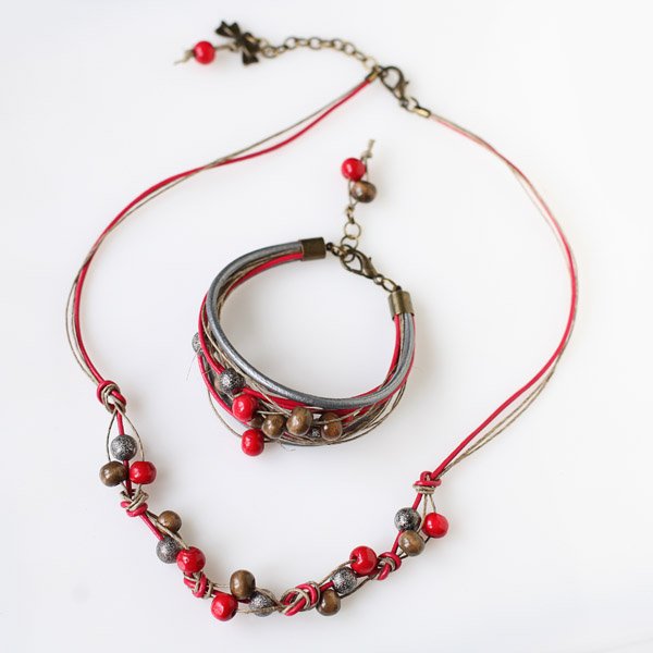 Komplet: bransoleta plus naszyjnik. w tonacji jesiennej: srebrzysta szarość, soczysta czerwień, khaki. Teksturowane kule w kolorze oksydowanego srebra dodają elegancji. . Bransoleta mierzy 19 - 21 cm, Naszyjnik: 51 -56 cm. Komplet podróżuje ładnie zapakowany :). Aby zamówić inny rozmiar proszę o info w opcjach wyboru.