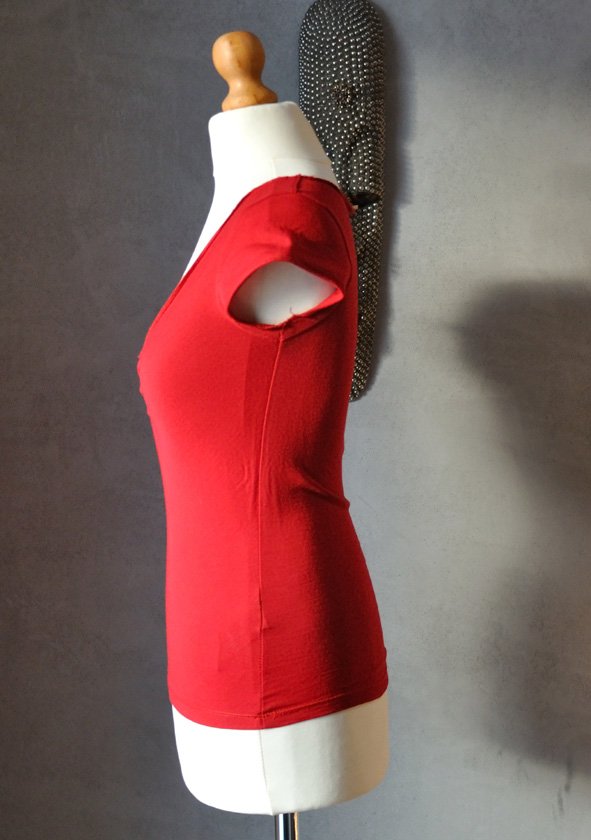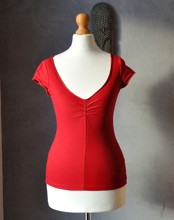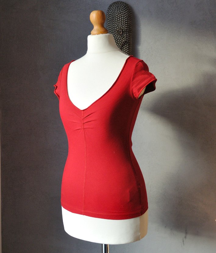 Solidnie uszyta, ma duży, trójkątny dekolt z marszczeniem, od dekoltu w dół biegnie ozdobny, szeroki szew na wierzchu. Mikro rękawki. Obcisła.
