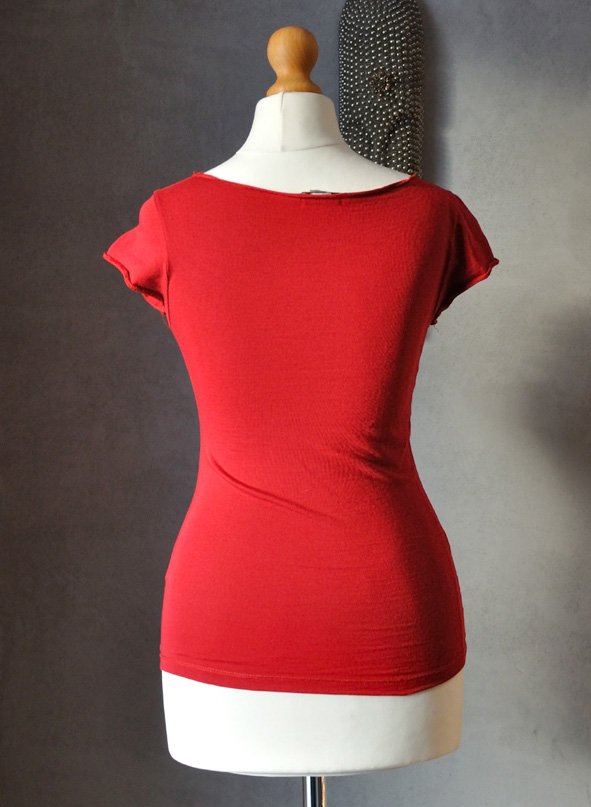 Uszyta z bawełny w pełnym, niesamowicie nasyconym i przyjemnym w odbiorze odcieniu czerwieni.