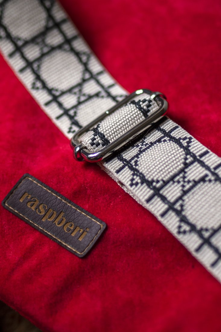 Torebka posiada regulowany pasek w kolorze kremowym w czarne wzory i srebrne okucia.