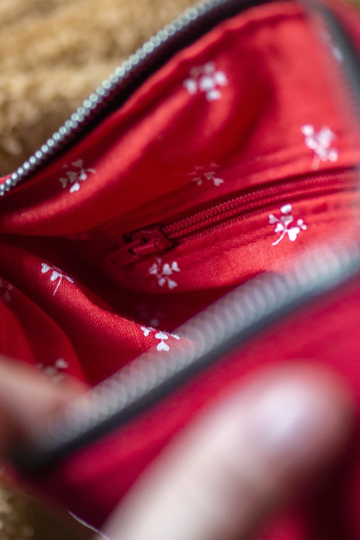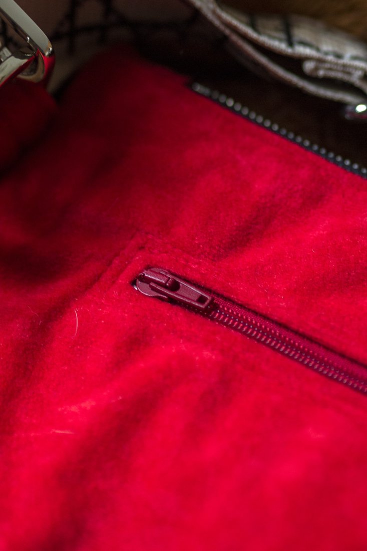 Małe zaszewki na dnie. Z tyłu oraz w środku torebki kieszonki zapinane na suwak. Środek wykończony bawełnianą podszewką.