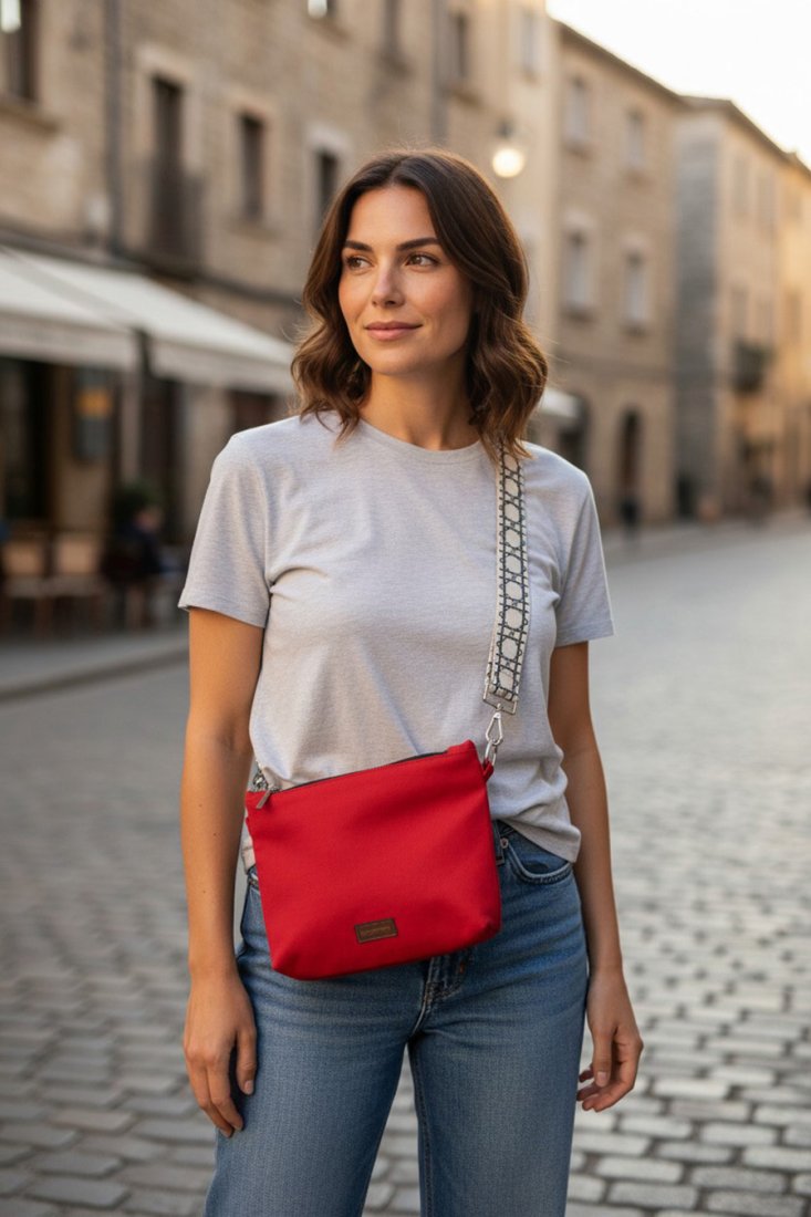 Prosta torebka, kopertówka w średnim rozmiarze wykonana z czerwonego weluru. Zapinana na suwak.