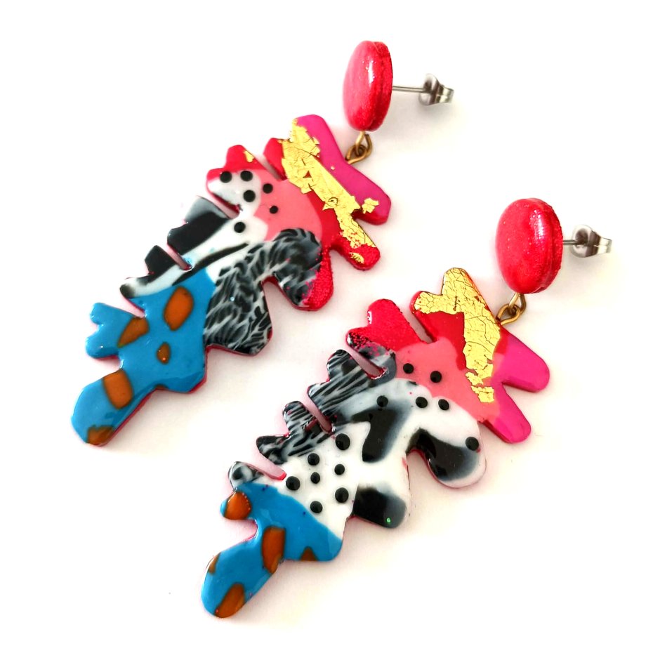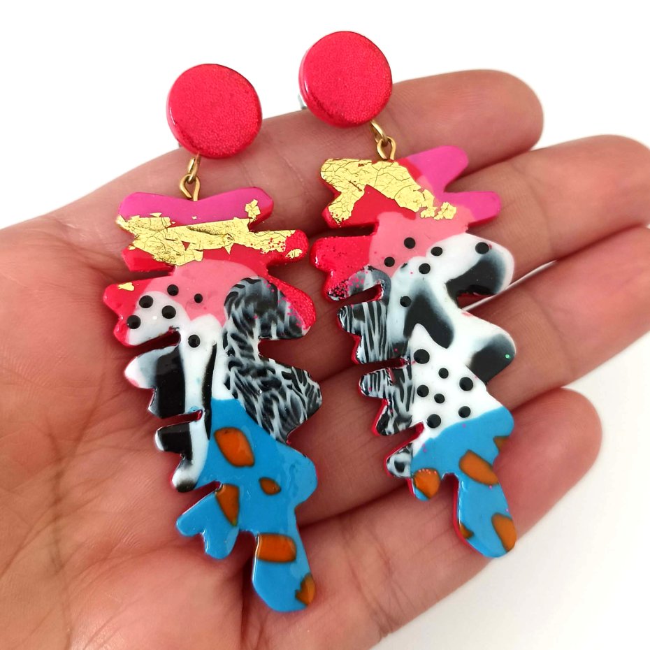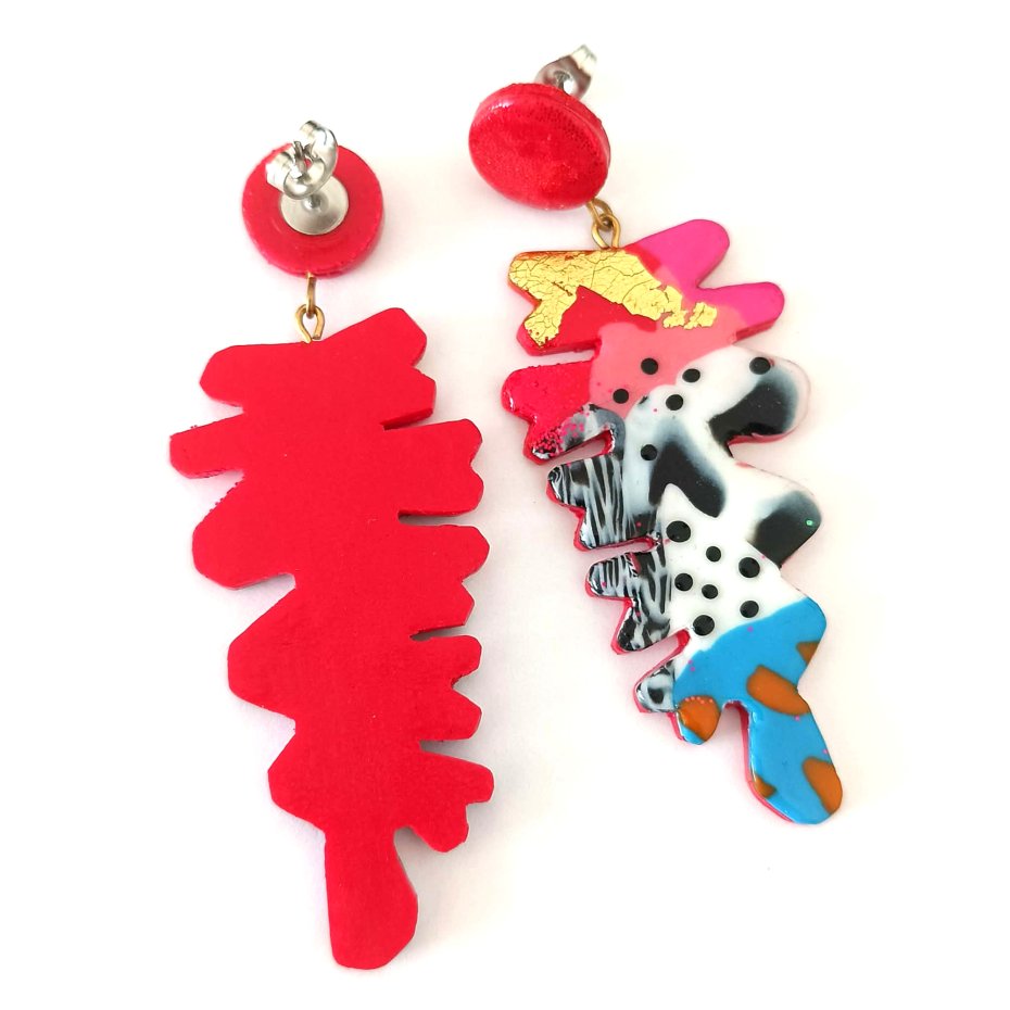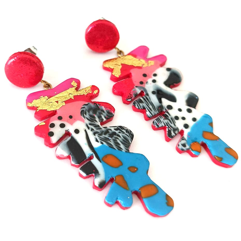 Kolczyki mają nowoczesny, abstrakcyjny design z żywymi kolorami oraz organiczną formą, która nadaje im lekki, artystyczny charakter. Błyszczący czerwony sztyft na górze pięknie odbija światło, a kolorowa, abstrakcyjna forma z kontrastującymi detalami tworzy odważny, współczesny wygląd.