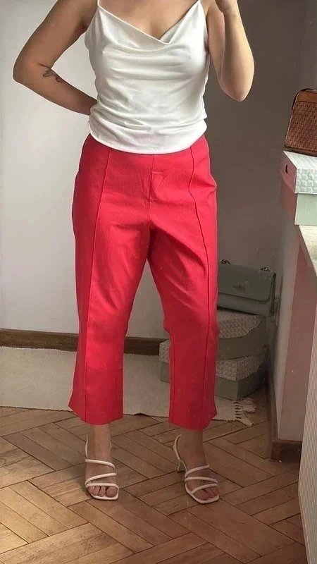 Precyzyjnie skrojone spodnie w intensywnym czerwonym odcieniu, wyróżniające się podwyższonym pasem i subtelnymi szwami bocznymi. Wykonane z gładkiej, lekko elastycznej tkaniny, zapewniają komfort noszenia. Fason prosty z lekko zwężanymi nogawkami, dodający sylwetce smukłości. Idealne dla miłośników unikalnych dodatków w garderobie.