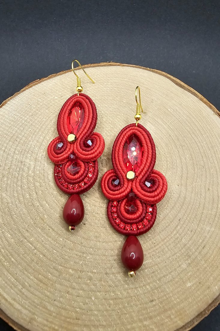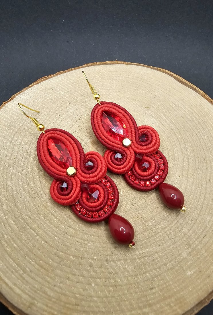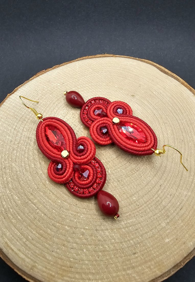 Czerwone fasetowane kryształki otoczone polskimi sznurkami sutasz, szklanymi koralikami w odcieniach bordo i czerwieni o różnych wielkościach. Dopełnieniem kolczyków jest pięknie błyszcząca taśma cyrkoniowa. Dół kolczyków zakończony szklanymi kroplami. Kolczyki zawieszone na klasycznych biglach w kolorze złota.