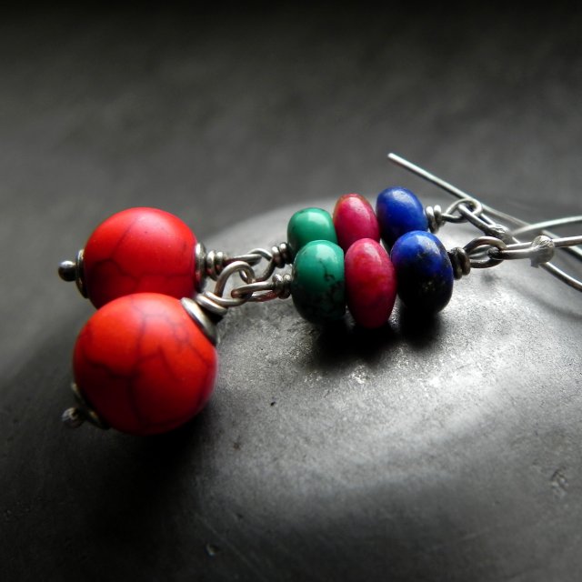 Świetne kolczyki w soczystych barwach, wykonane zostały z kuleczek howlitu (10 mm), oponek turkusu, lapisu lazuli i agatu (5 mm) oraz oksydowanego i przetartego srebra próby 925. Długość całkowita kolczyków wynosi 5,2 cm.