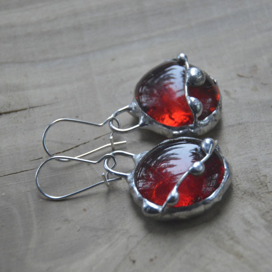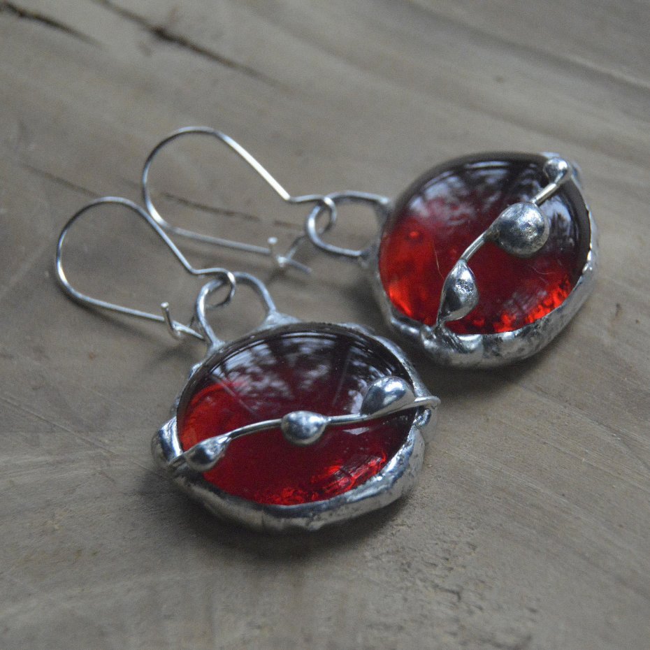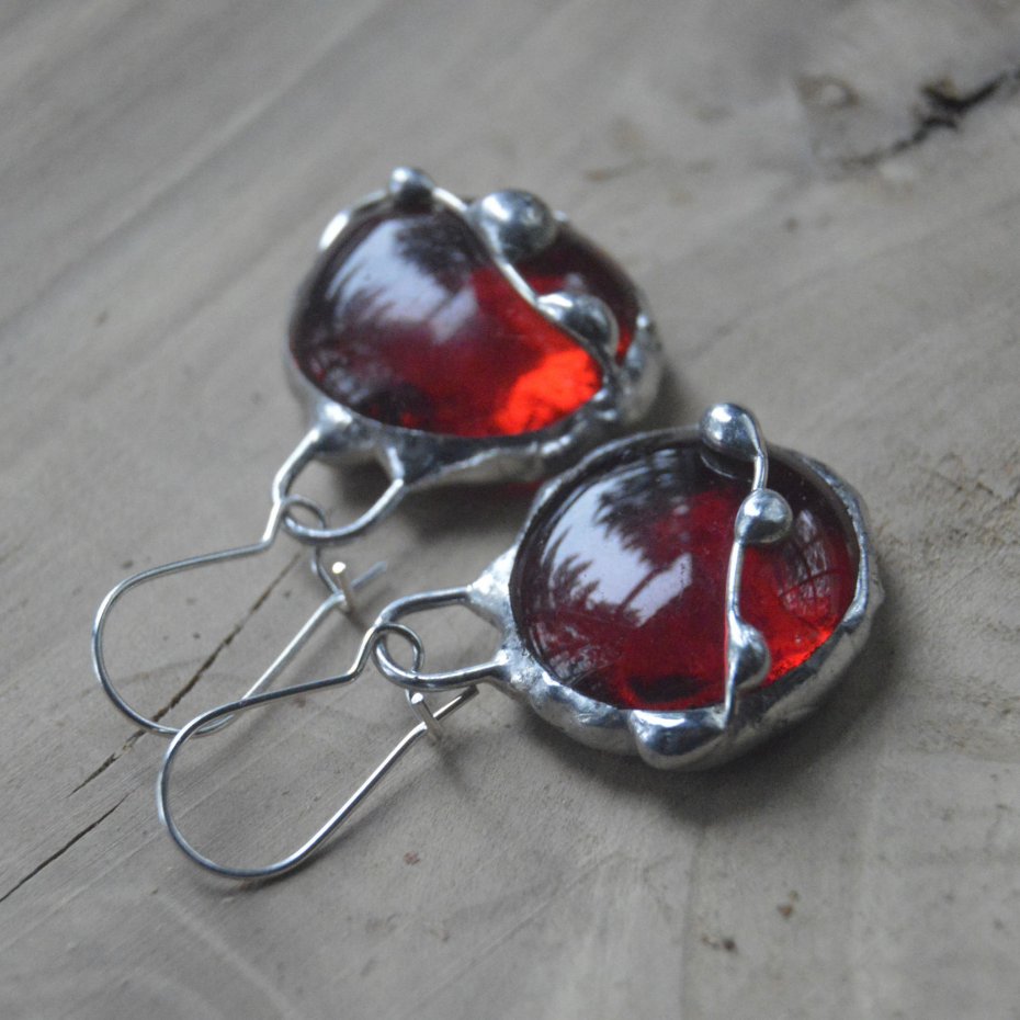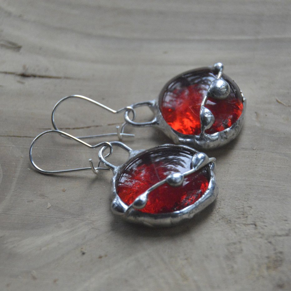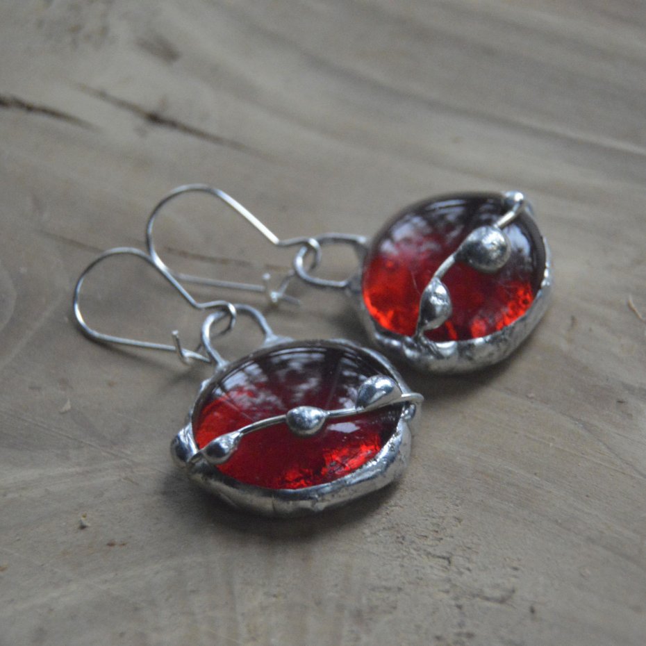 Kolczyki wykonane ręcznie z krwisto czerwonych szklanych kaboszonów witrażową metodą tiffany - zawieszone na zamykanych biglach. Długość kolczyków wraz z biglami to 4.5 cm. Zapraszam do zakupu..