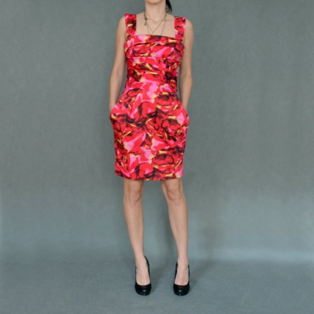 Przepiękna sukienka w czerwone kwiaty. Krój tulipana, po bokach kieszonki. Z tyłu zapinana na zamek. Wykonana z grubej, mięsistej, porządnej bawełny. Polecam, jest cudowna.