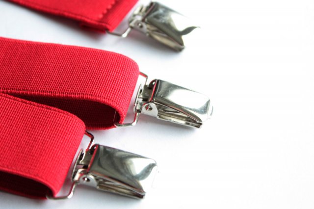 Elastyczne szelki w głębokim odcieniu czerwieni z metalowymi sprzączkami w kolorze srebrnym.
