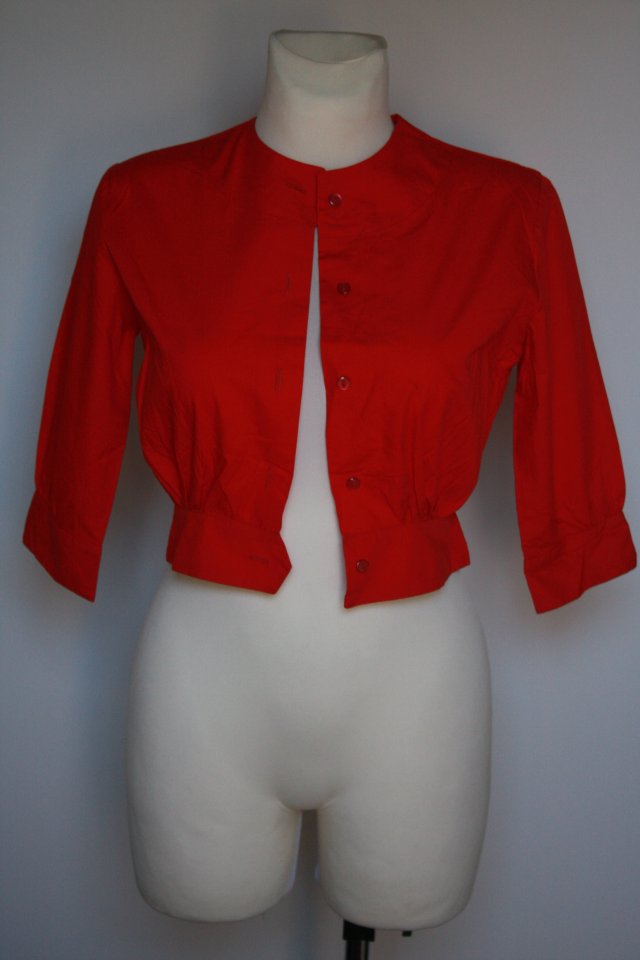 mocno czerwone cienkie króciutkie wdzianko vintage zapinane na guziki, rękawy do łokcia zapinane na guzik, brak metki ze składem, materiał lekko sztywniejszy