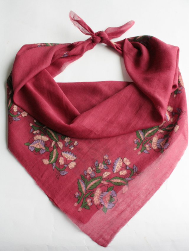 Bordowa chusta z kwiatowymi ornamentami. Materiał to prawdopodobnie bawełna.