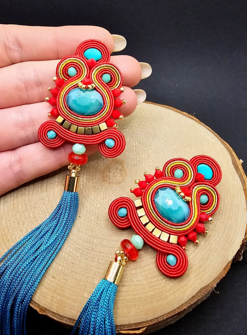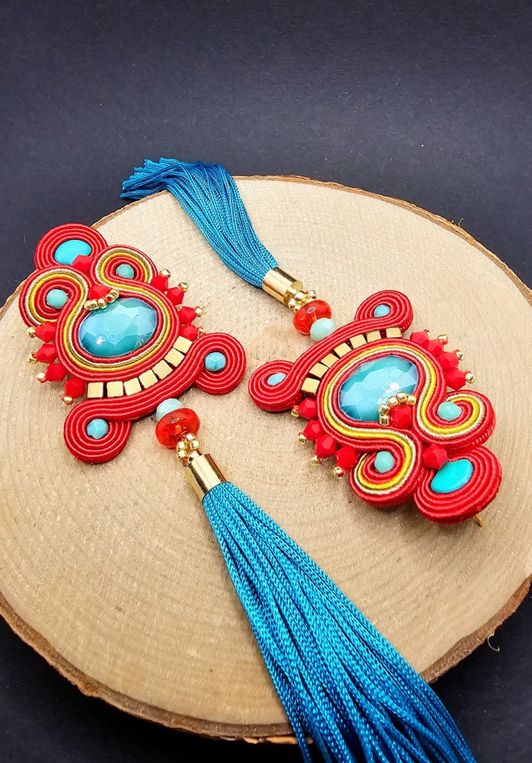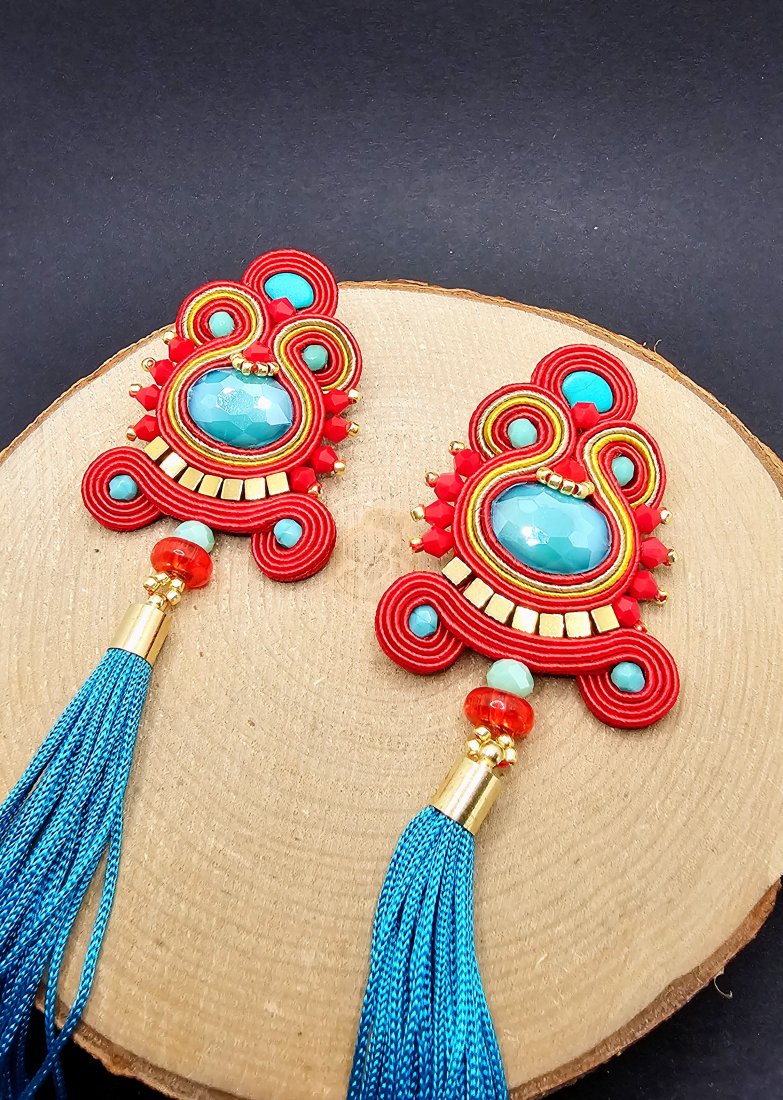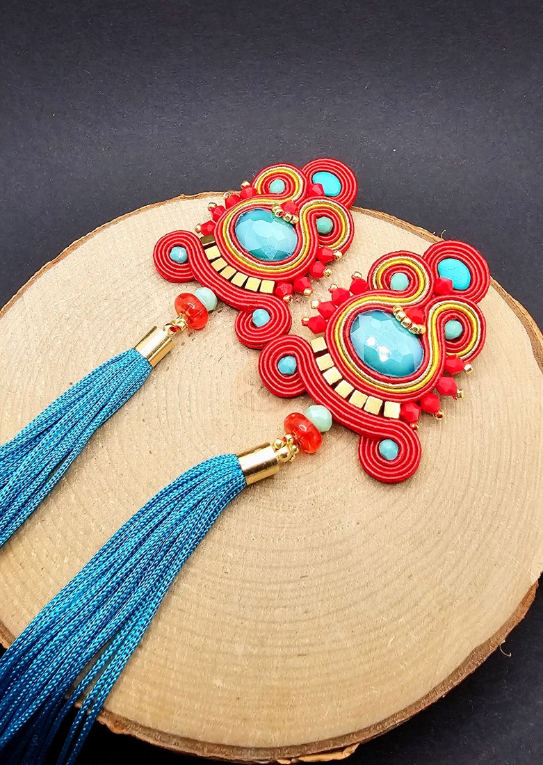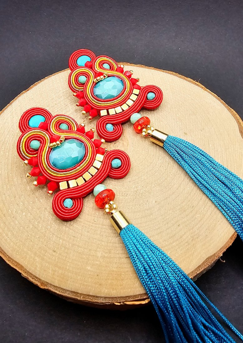 czerwono-turkusowe kolczyki sutasz z chwostami