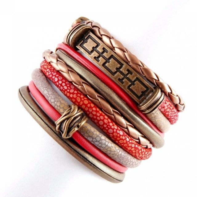 Ta wygodna i elegancka bransoletka została wykonana z różnych rzemyków w kolorach czerwonym, beżowy, miedzianym i w kolorze antycznego złota.