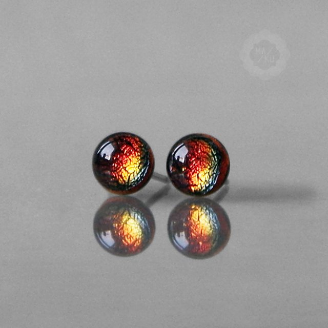 Szklane kolczyki- sztyfty wykonane, z niezwykłego,pięknie mieniącego się szkła, metodą fusingu. Kolor kolczyków zmienia się,zależnie od kąta patrzenia.