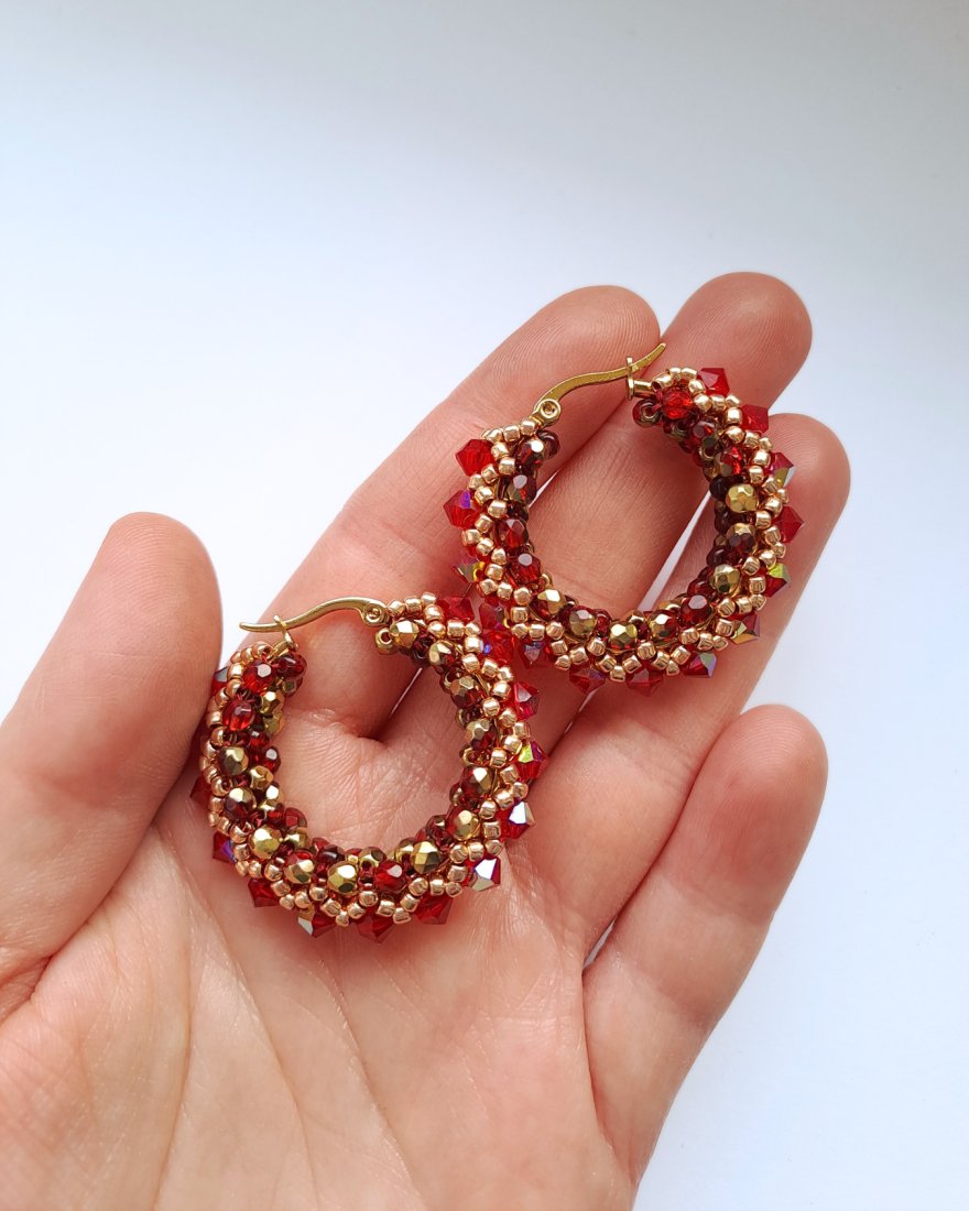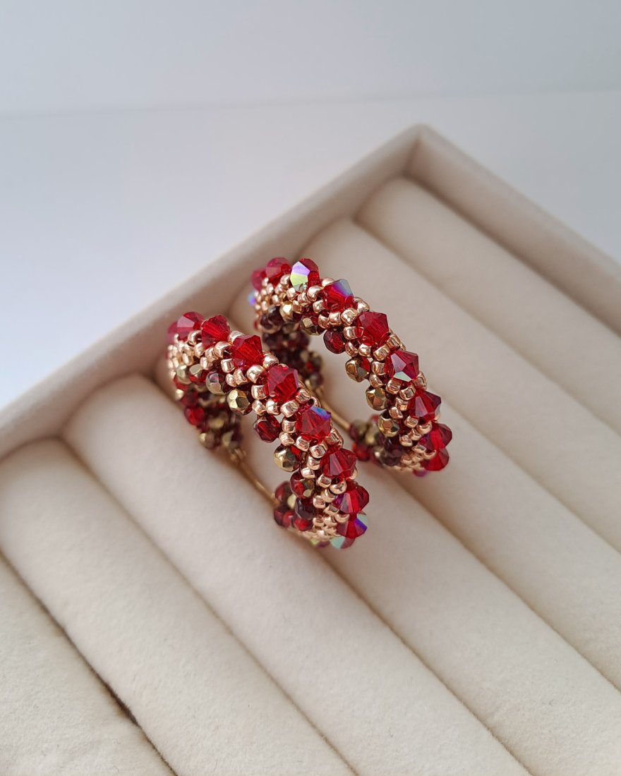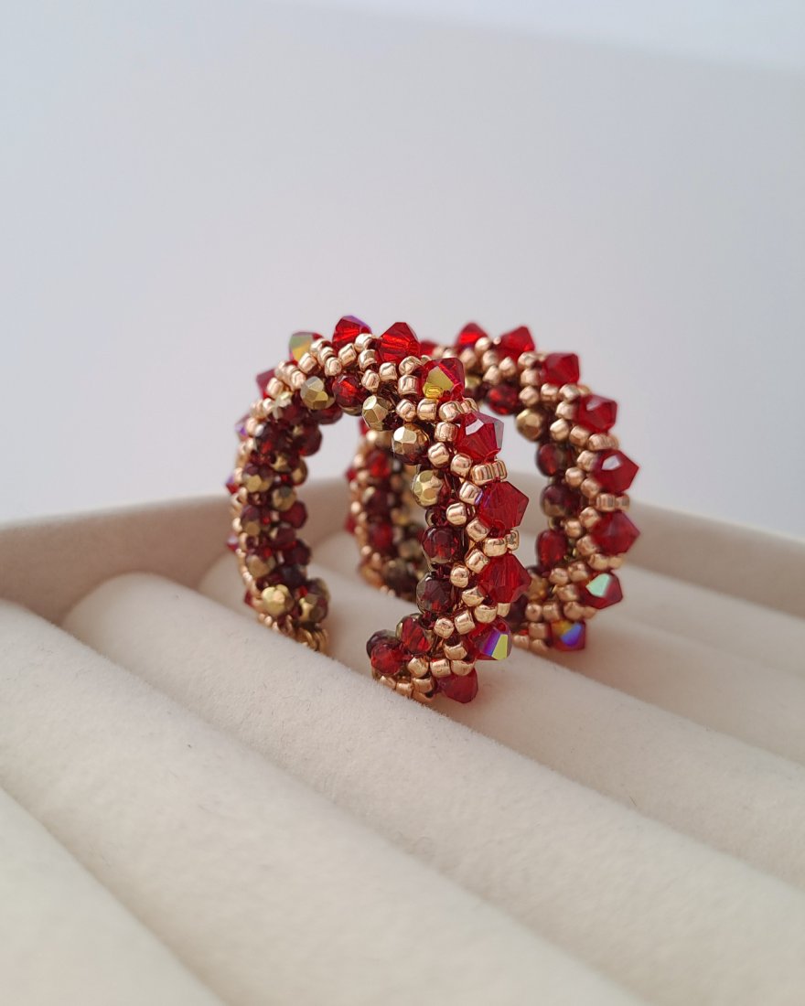 Całość zdobią kryształki Preciosa Bicone 4 mm w kolorze Siam AB – intensywnej czerwieni z subtelnym, opalizującym połyskiem, który pięknie odbija światło i nadaje biżuterii wielowymiarowego blasku.