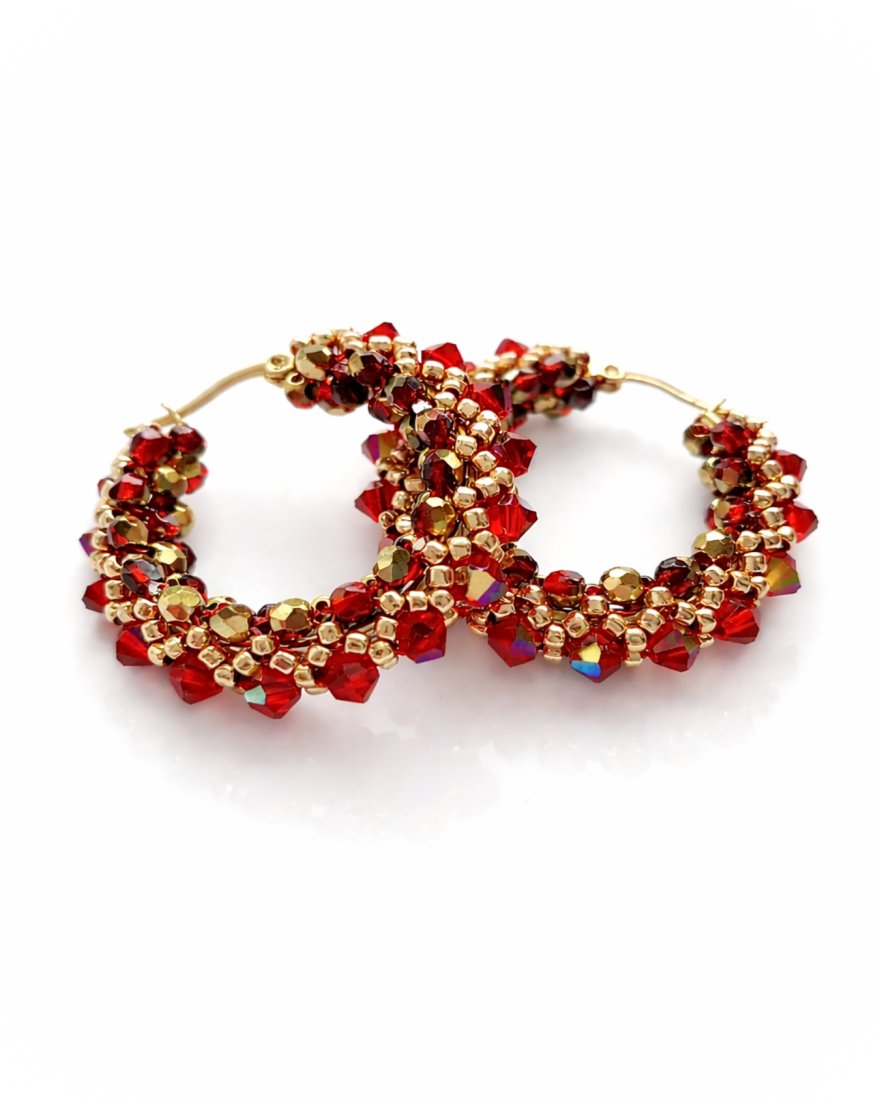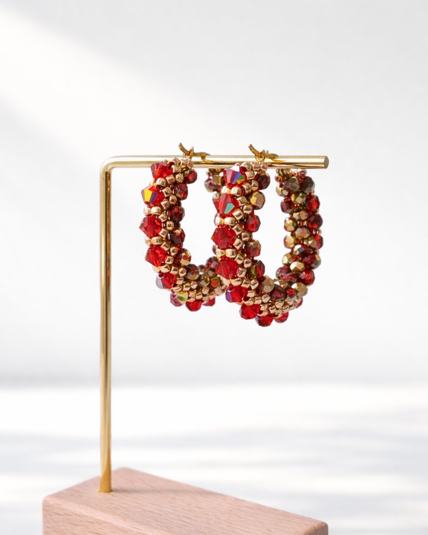 Te wyraziste kolczyki w formie klasycznych kół przyciągają spojrzenia intensywną, głęboką czerwienią i wyjątkowym blaskiem. Ich nasycony kolor w połączeniu ze złotymi akcentami tworzy biżuterię pełną energii, elegancji i charakteru.