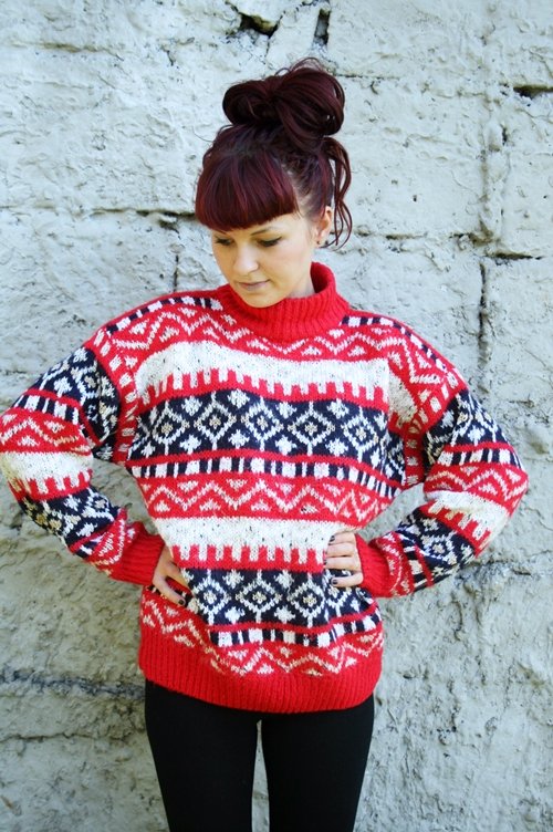 Czerwony sweter we wzory, rozmiar s/m,w rzeczywistosci ładniejszy jak na zdj.aparat nie uchwtcił piekna kolorow,zdj.wyk.na osobie noszacej rozm.S