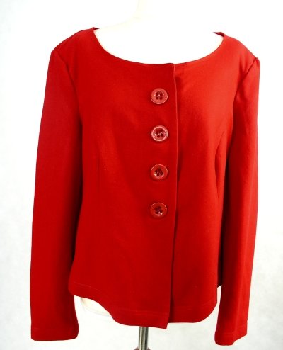 Czerwony żakiet-zdjęcie przekłamuje kolor.Obcięte metki.Materiał miękki,przyjemny w dotyku.W ramionach małe poduszki.Zapinany z przodu na duże guziki + na górze zatrzaska.Rękaw długi,prosty.Tył w dole odcięty.Stan bardzo dobry.Długość 61 cm.pod pachami 114 cm.