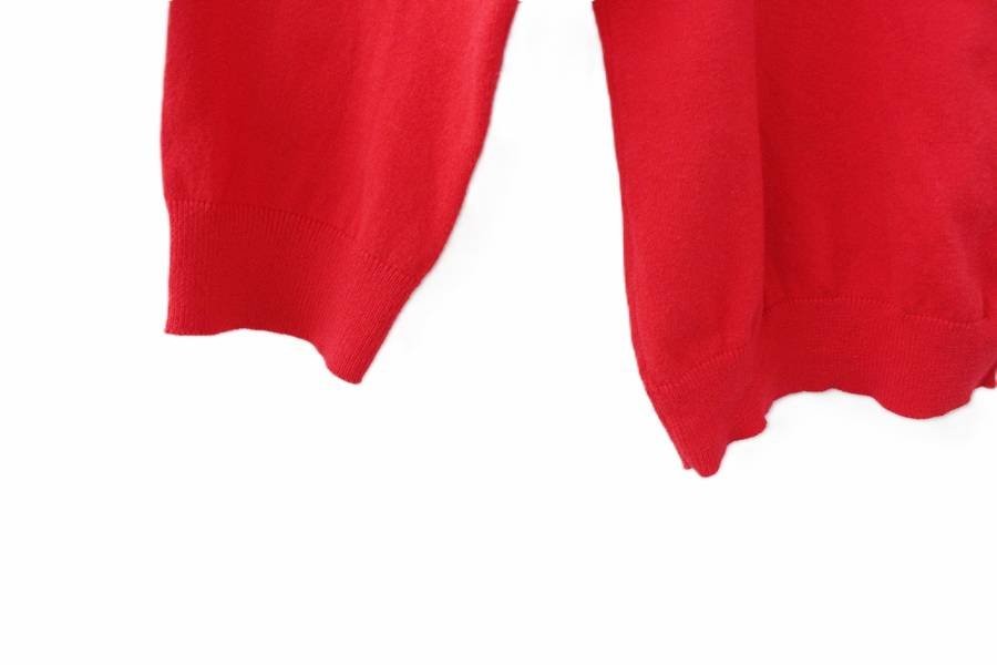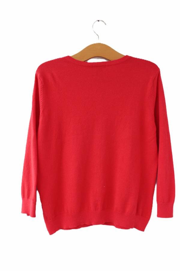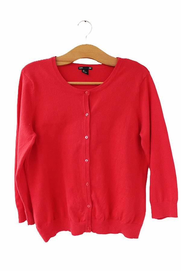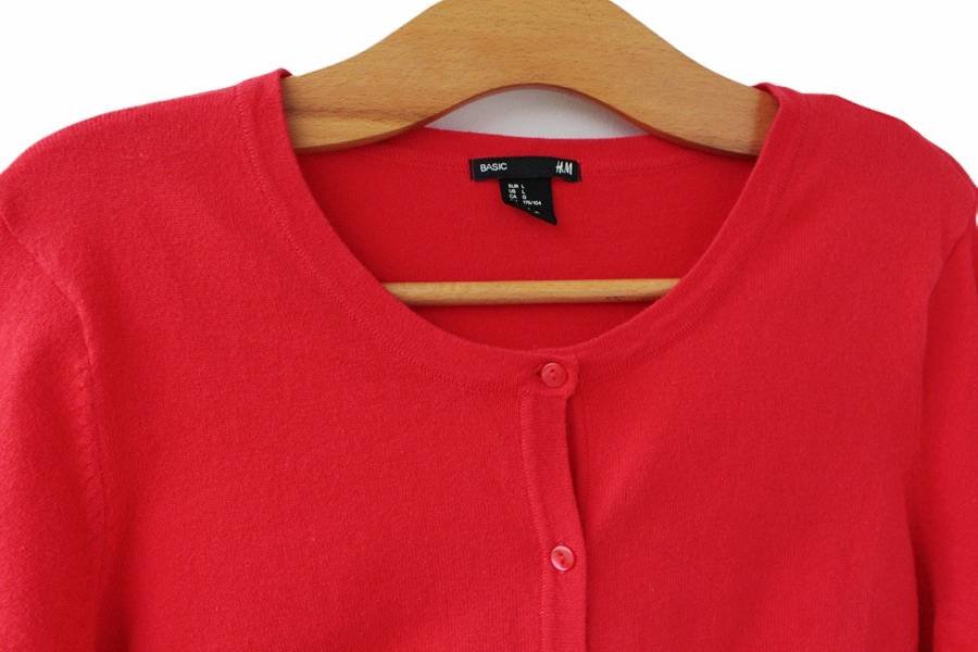 Miękki kardigan vintage w pięknym, ciepłym odcieniu czerwieni. Ponadczasowy krój i odcień, który podkreśli urodę i ożywi wiele stylizacji.