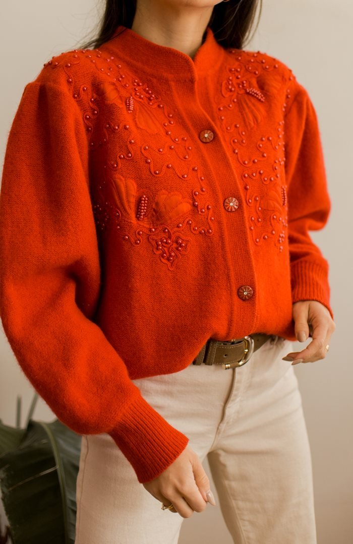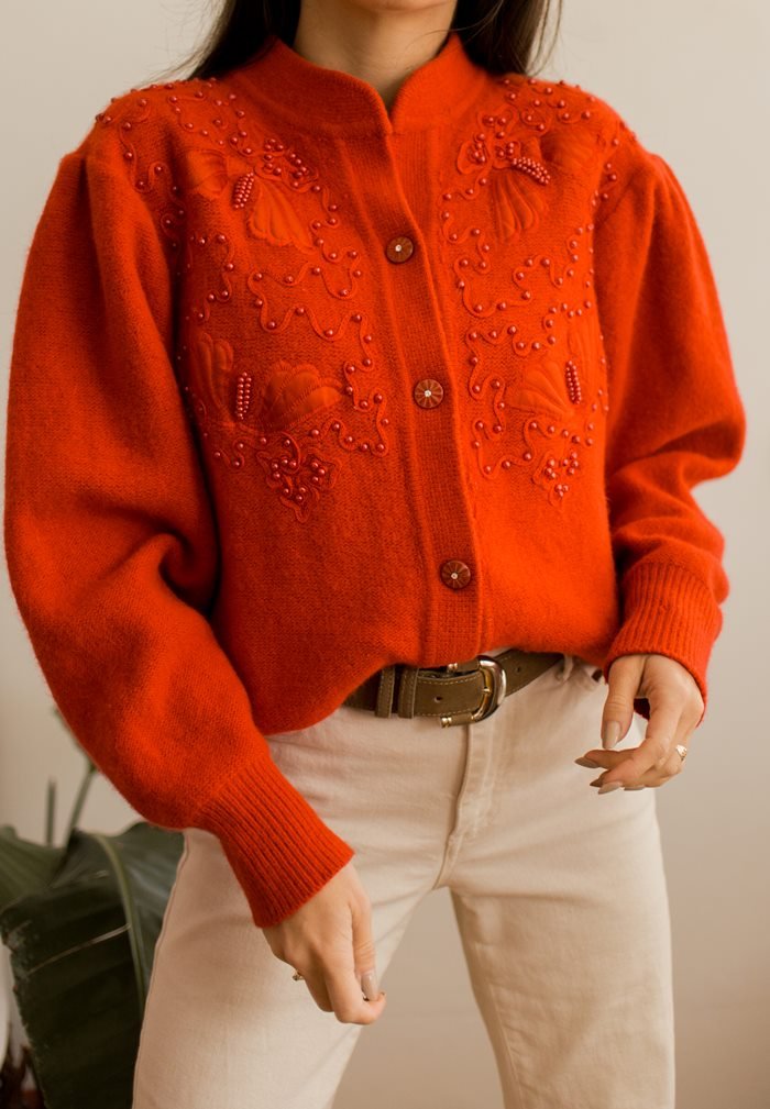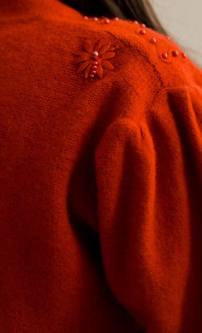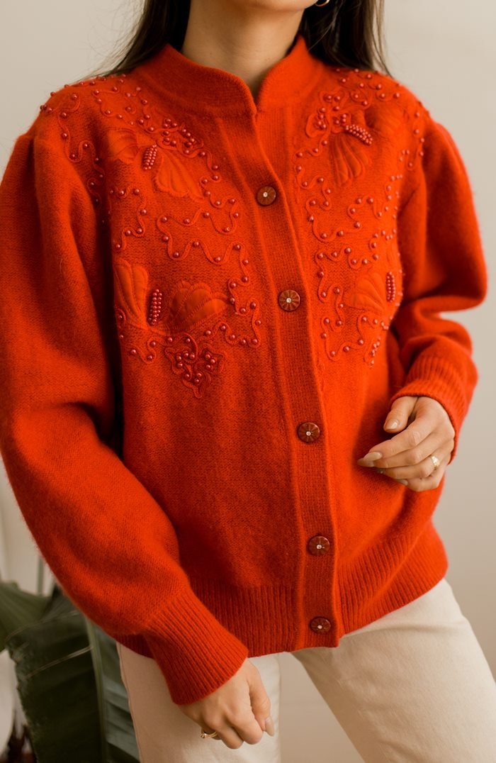 Czerwony kardigan vintage wyszywany koralikami i kwiatami.