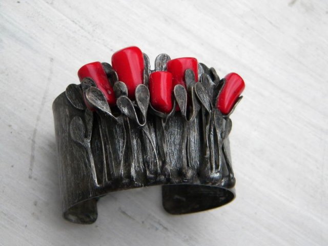 Bransoleta z ocynowanej miedzi i czerwonego korala. Oksydowana,stylizowana na stare srebro. maksymalna szerokosć 4,7cm.