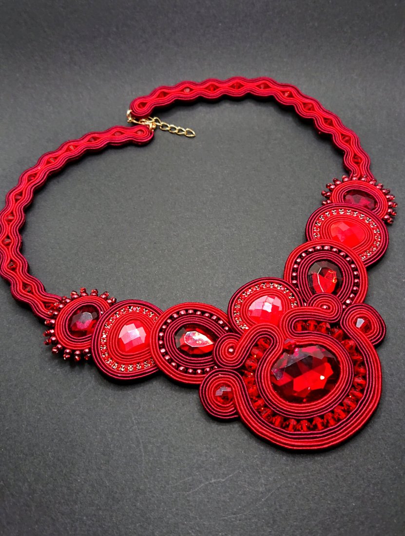 Fasetowane błyszczące kryształki otoczone sznurkami sutasz w odcieniu czerwieni i koloru bordowego oraz szklanymi koralikami o różnych kształtach i wielkościach. Naszyjnik uzupełnia taśma z cyrkoniami, która nadaje jeszcze więcej blasku. Naszyjnik posiada regulowaną długość przy zapięciu.