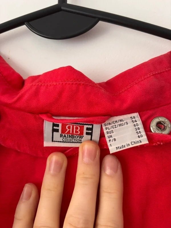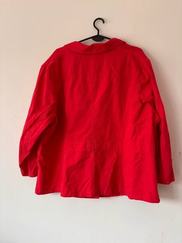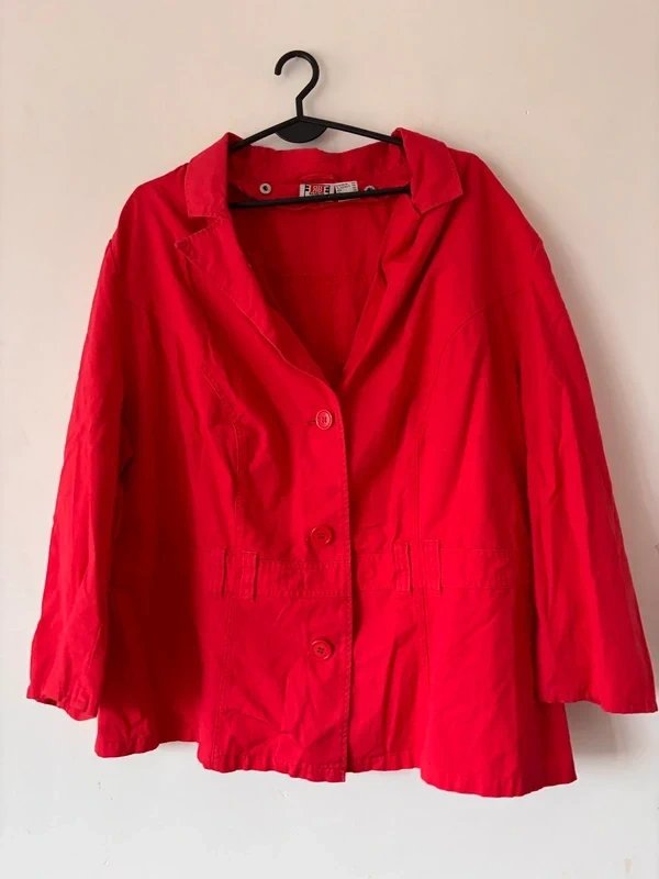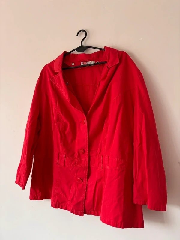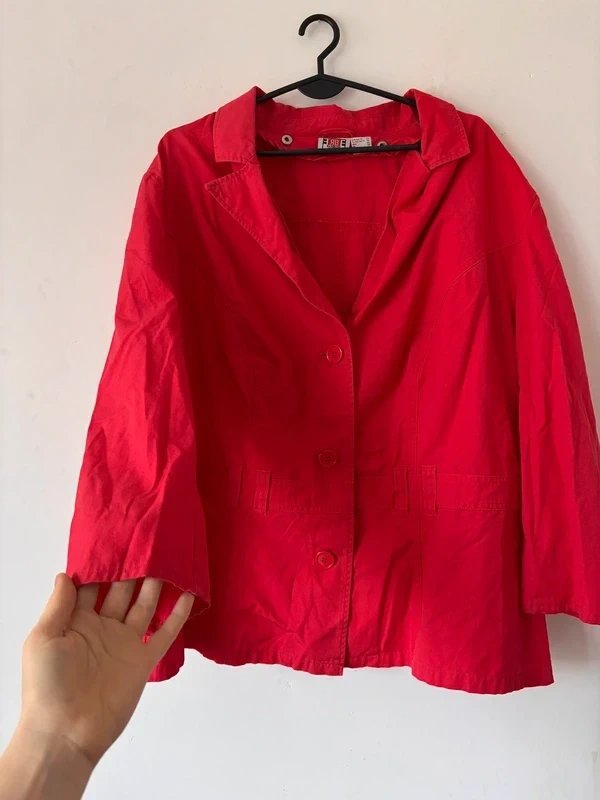 Stylowy żakiet z lat 90., intensywnie czerwony, z dużymi guzikami i lekkim rozkloszowaniem w talii. Idealny jako statement piece — do jeansów lub spódnicy.