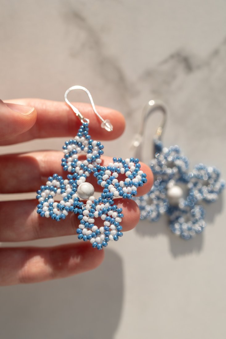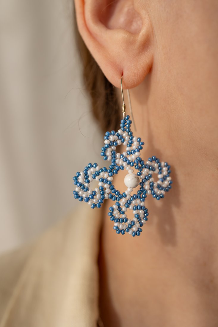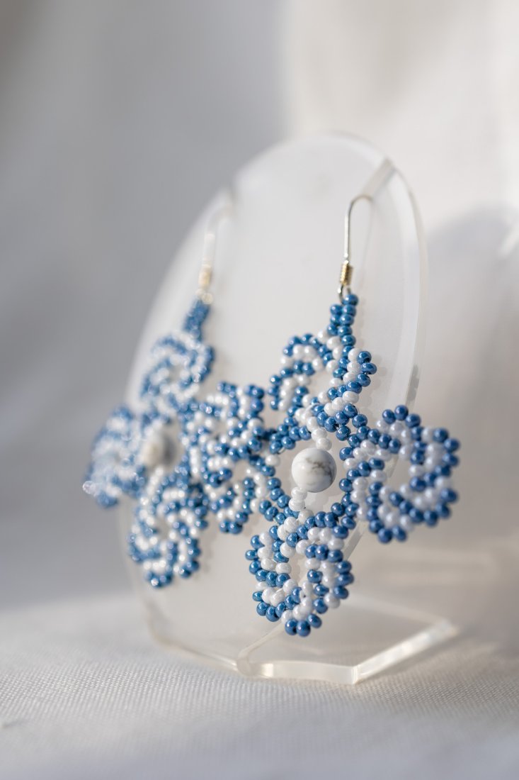 Ręcznie wykonane kolczyki z drobnych czeskich koralików szklanych w kolorze niebieskim i białym, ułożonych w symetryczny, ażurowy wzór przypominający kwiaty ❀. W centralnej części każdego kolczyka znajduje się kulka howlitu w odcieniu białym z charakterystycznym, szarym użyleniem. Posiadają srebrne bigle, a w zestawie znajdują się silikonowe baranki zapewniające komfort i bezpieczeństwo noszenia. Lekkie, subtelnie kołyszą się podczas noszenia. Sprawdzą się zarówno na co dzień, jak i na specjalne okazje, a także jako prezent.