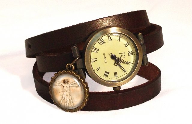 Zegarek ze skórzanym paskiem kilkakrotnie zakręcanym na ręku z ręcznie robioną zawieszką (kaboszonem).