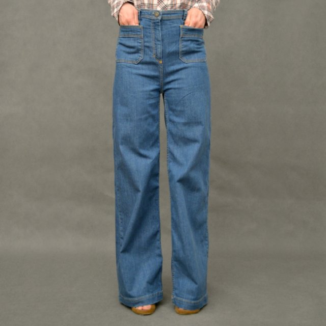 Rewelacyjne dżiny w stylu lat 70 tych. Do złudzenia przypominają te, które miała na sobie K.Janda w CZŁOWIEKU Z MARMURU. Z wyjątkowo wysokim stanem, dopasowanymi biodrami i szerokimi nogawkami. W bardzo ładnym odcieniu niebieskiego. Polecam, lata 70-te teraz to hit.