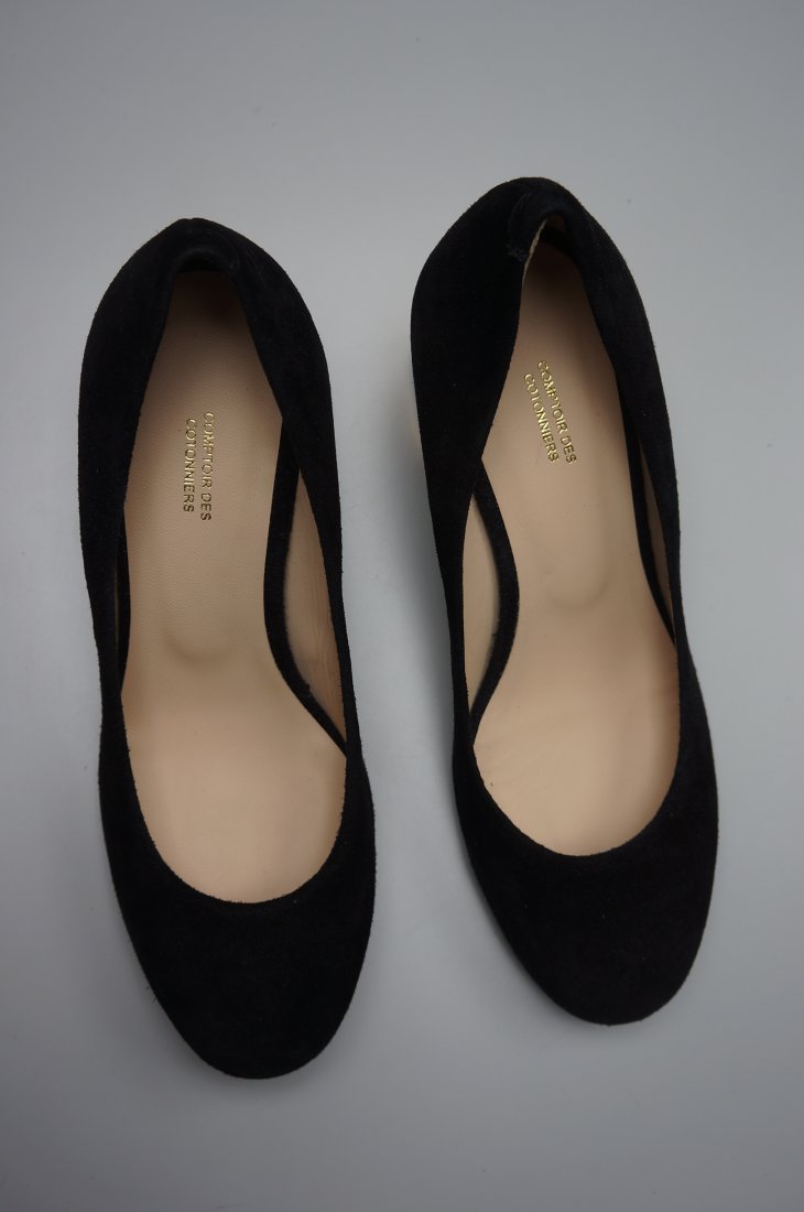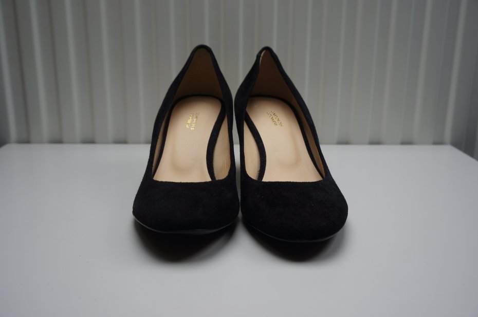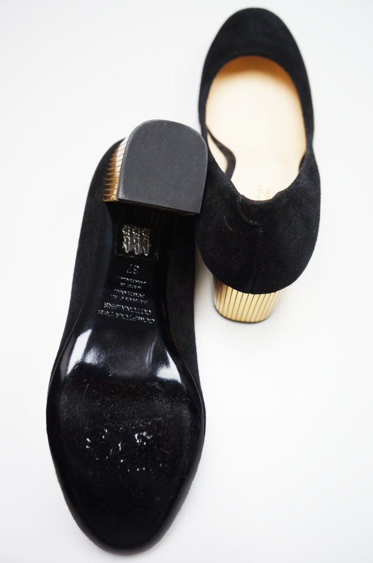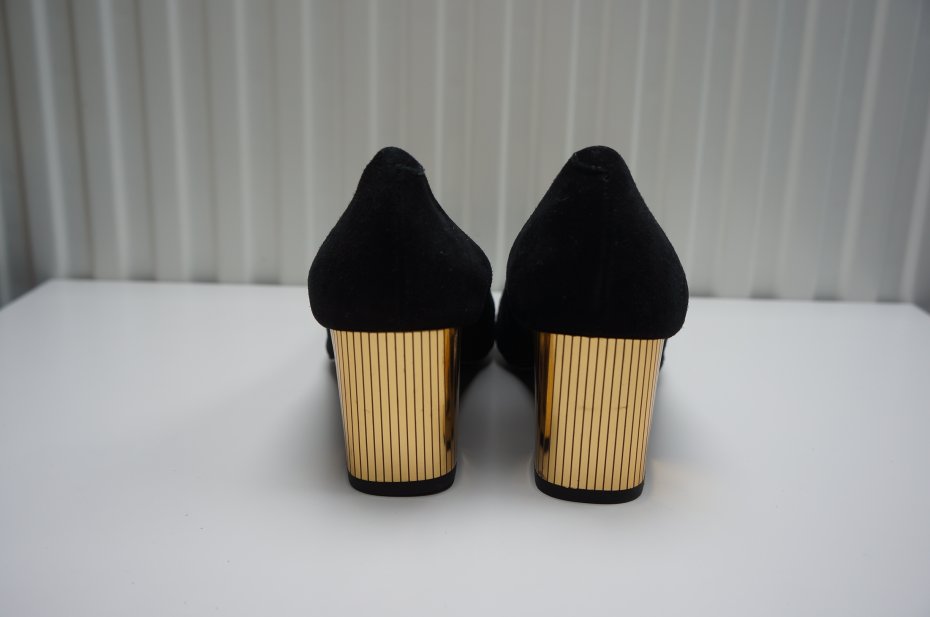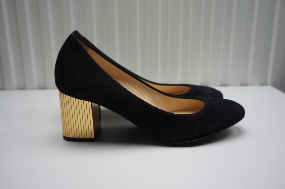 Eleganckie, bardzo wygodne zamszowe czółenka /skóra/ które można nosić do jeansów lub wieczorowej kreacji.Kolor czarny, obcas złoty. Nowe. Stan bardzo dobry.