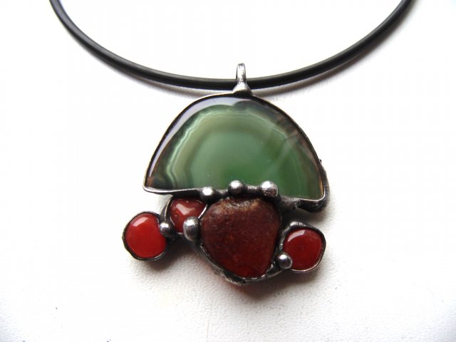 Wisiorek wykonany techniką witrażową z agatu, karneoli i surowego bursztynu. Zawieszony na czarnej lince kauczukowej o długości ok. 45 cm. Wymiary ok. 4,5 na 3,5 cm.
